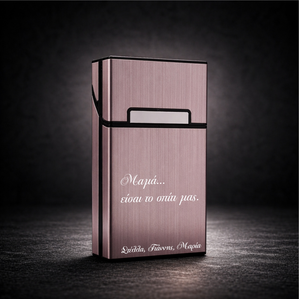Μια κομψή μεταλλική θήκη τσιγάρων, χαραγμένη με το δικό σας κείμενο — για να γίνει μοναδική, όπως και το άτομο που την κρατά.