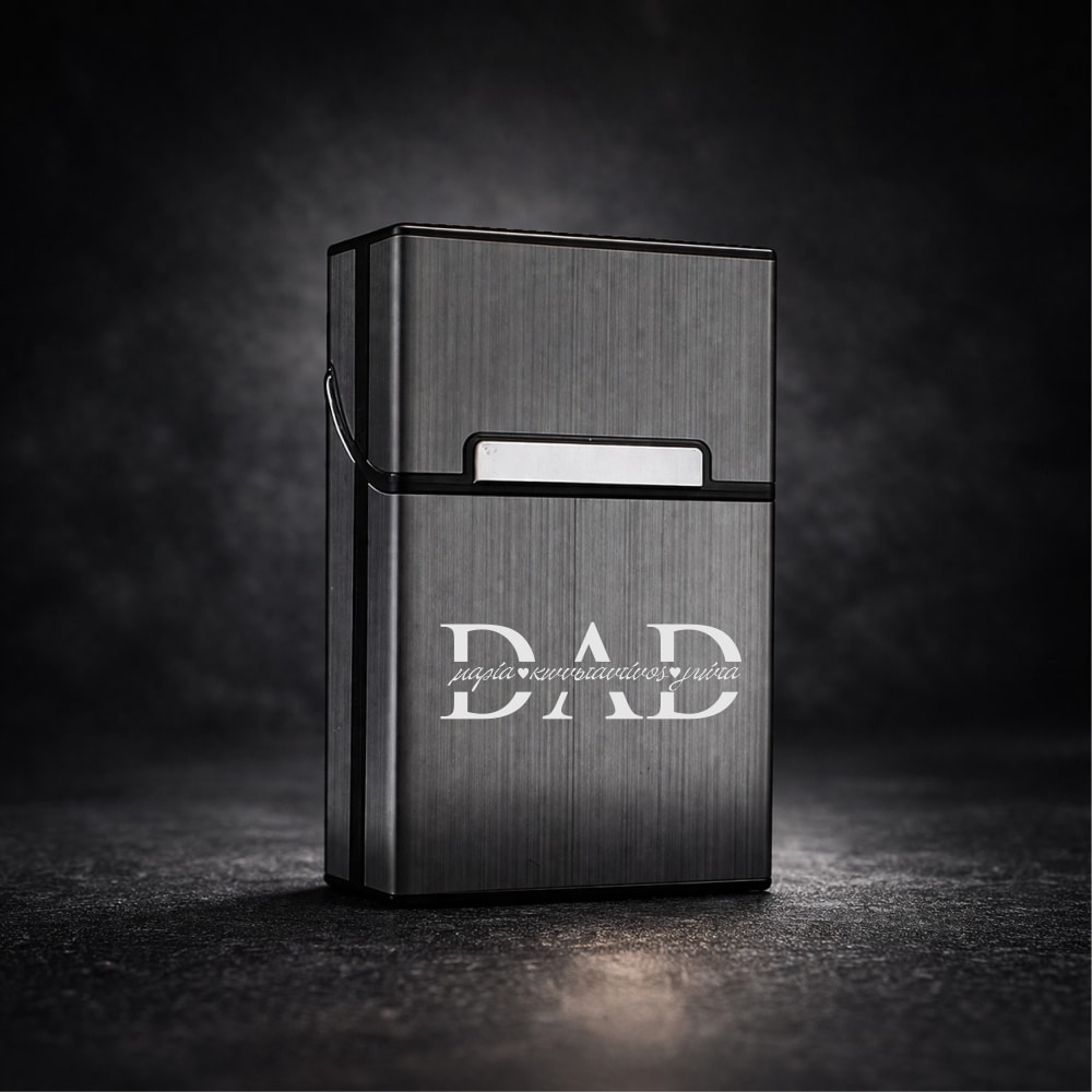 Μια κομψή μεταλλική θήκη τσιγάρων, χαραγμένη με τα ονόματα των παιδιών του — για να γίνει μοναδική, όπως και ο μπαμπάς τους που την κρατά.