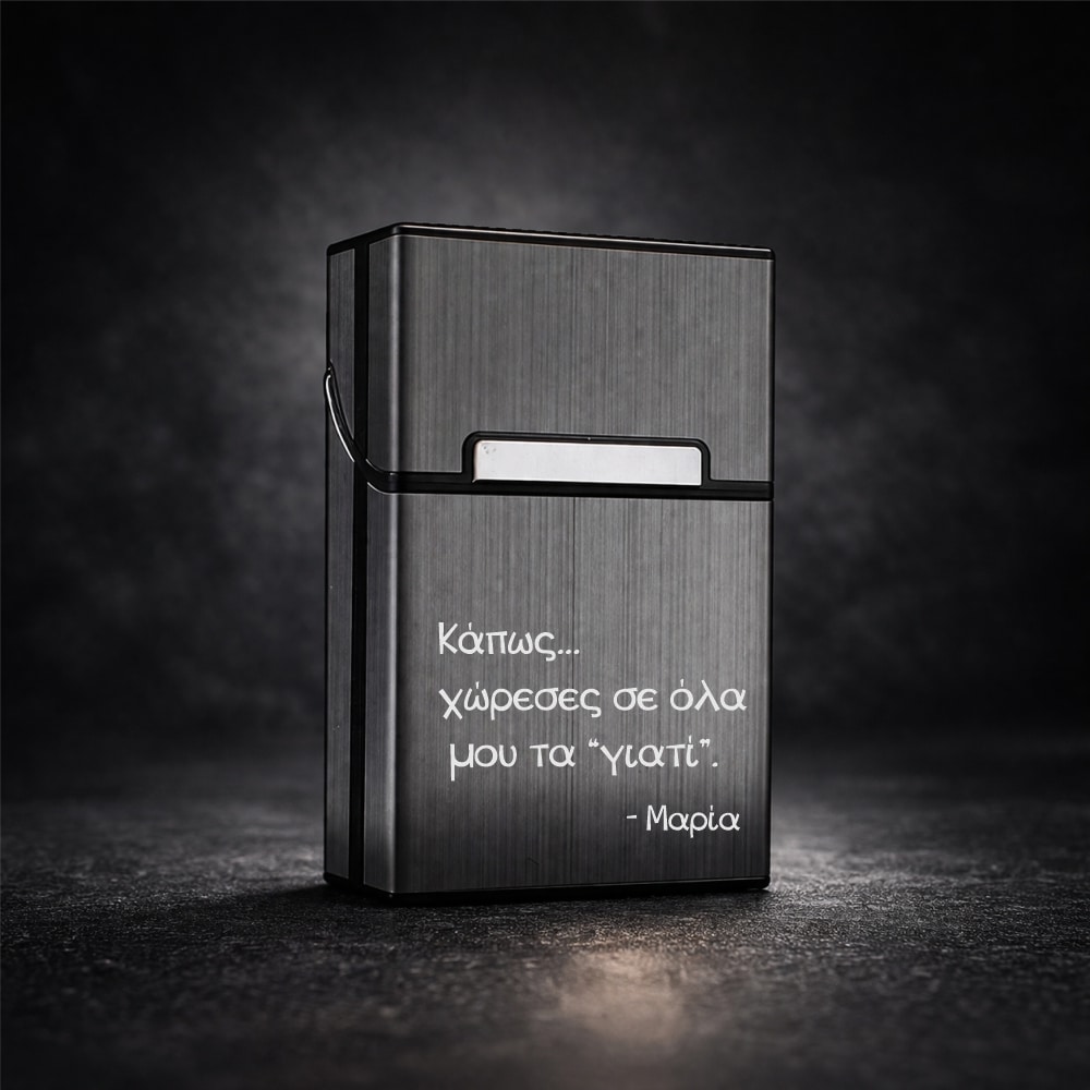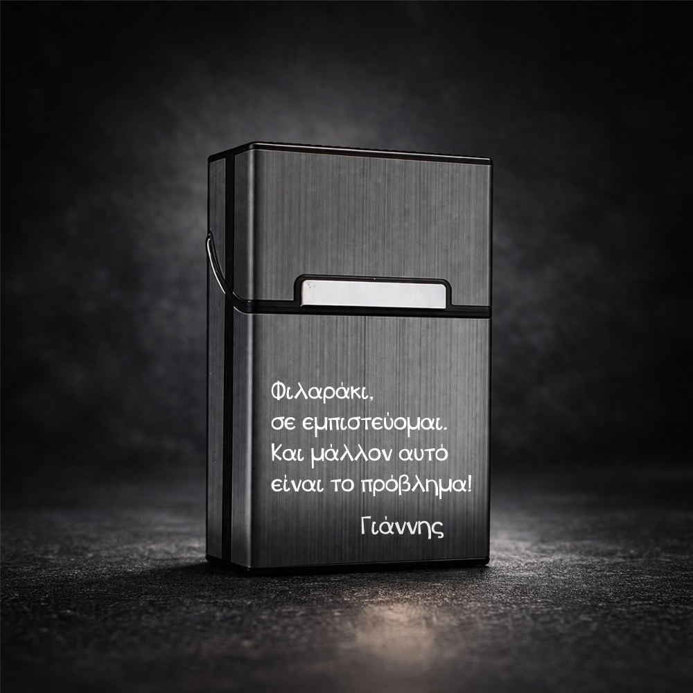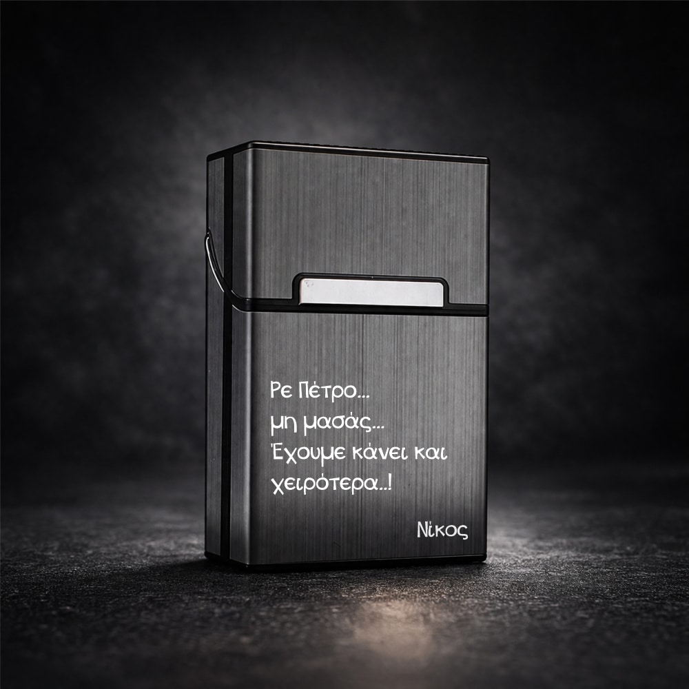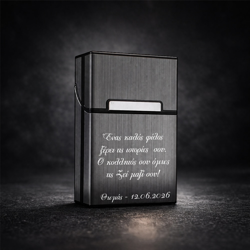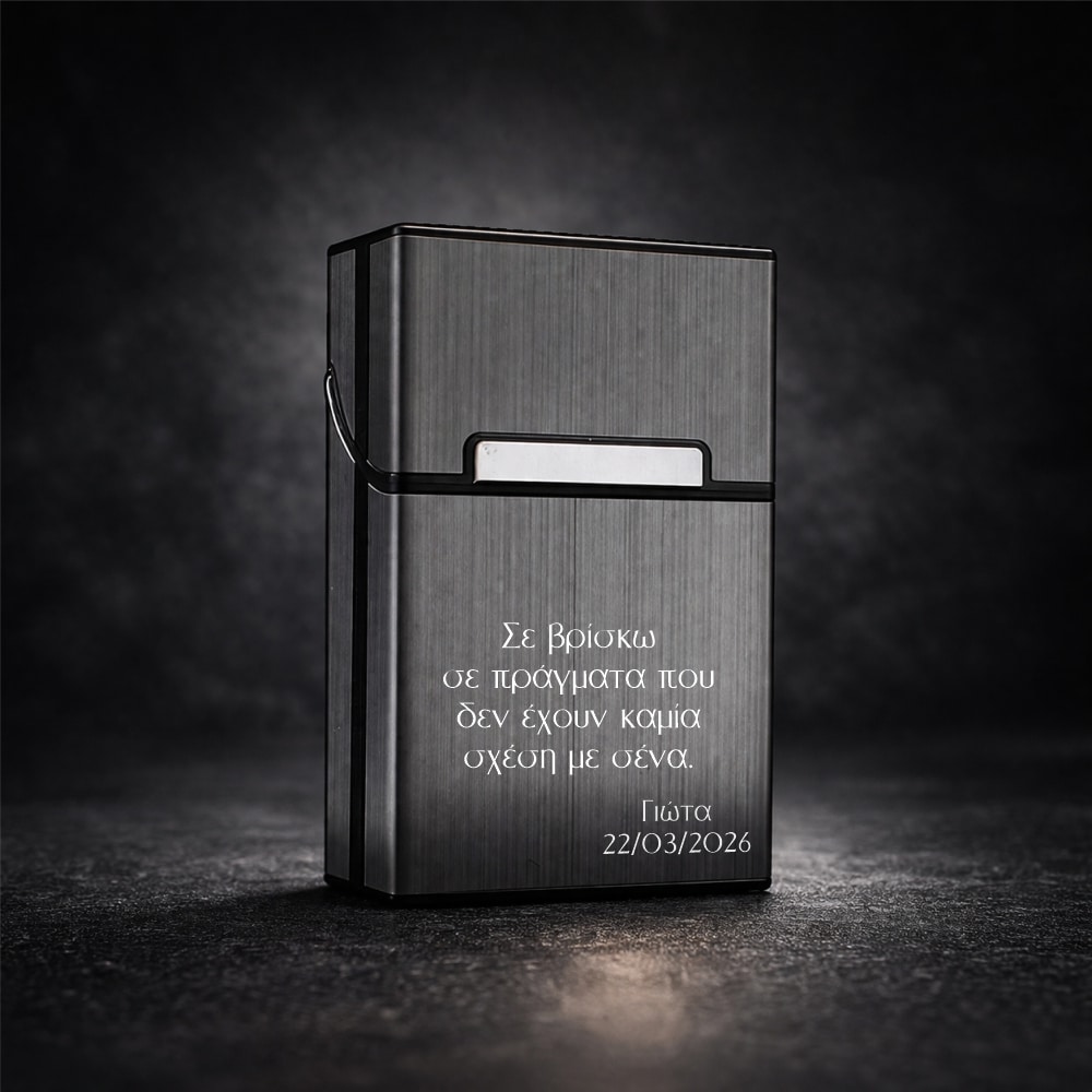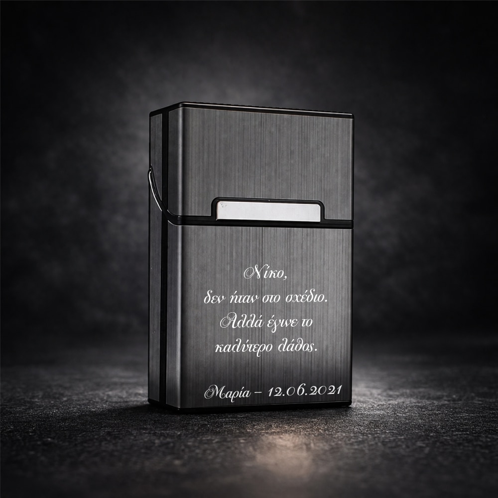 Μια κομψή μεταλλική θήκη τσιγάρων, χαραγμένη με το κείμενο που επιλέγεις — για να γίνει μοναδική, όπως και το άτομο που την κρατά.