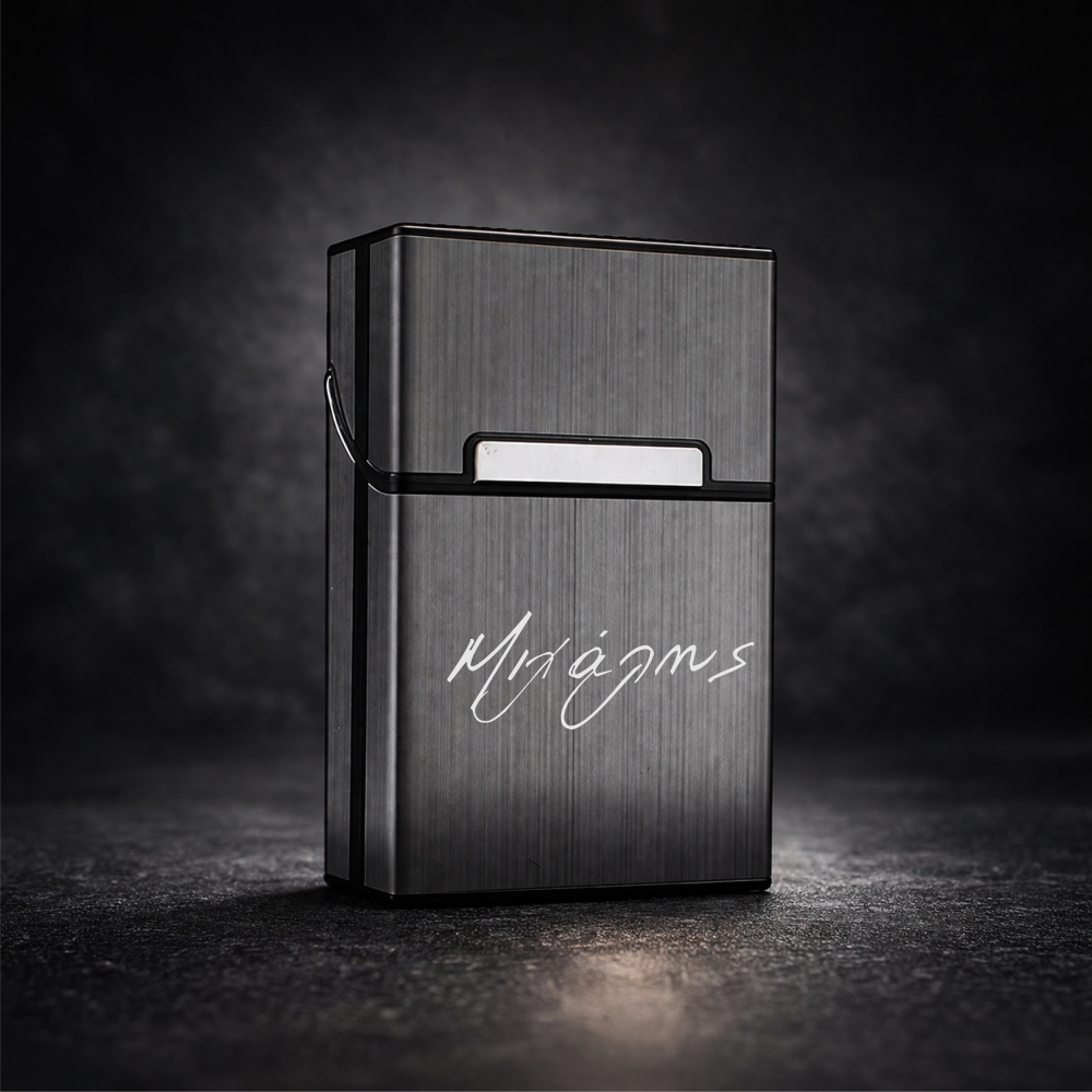 Μια κομψή μεταλλική θήκη τσιγάρων, χαραγμένη με το όνομα που επιλέγεις — για να γίνει μοναδική, όπως και το άτομο που την κρατά.